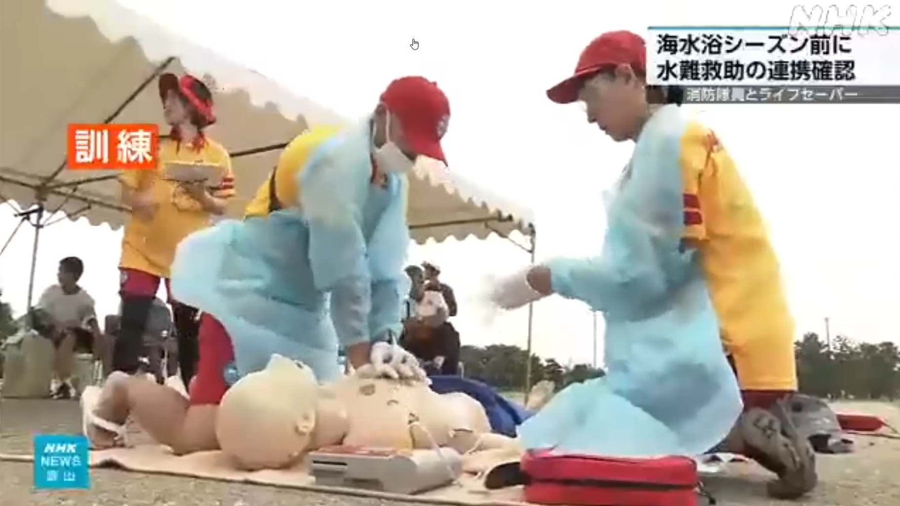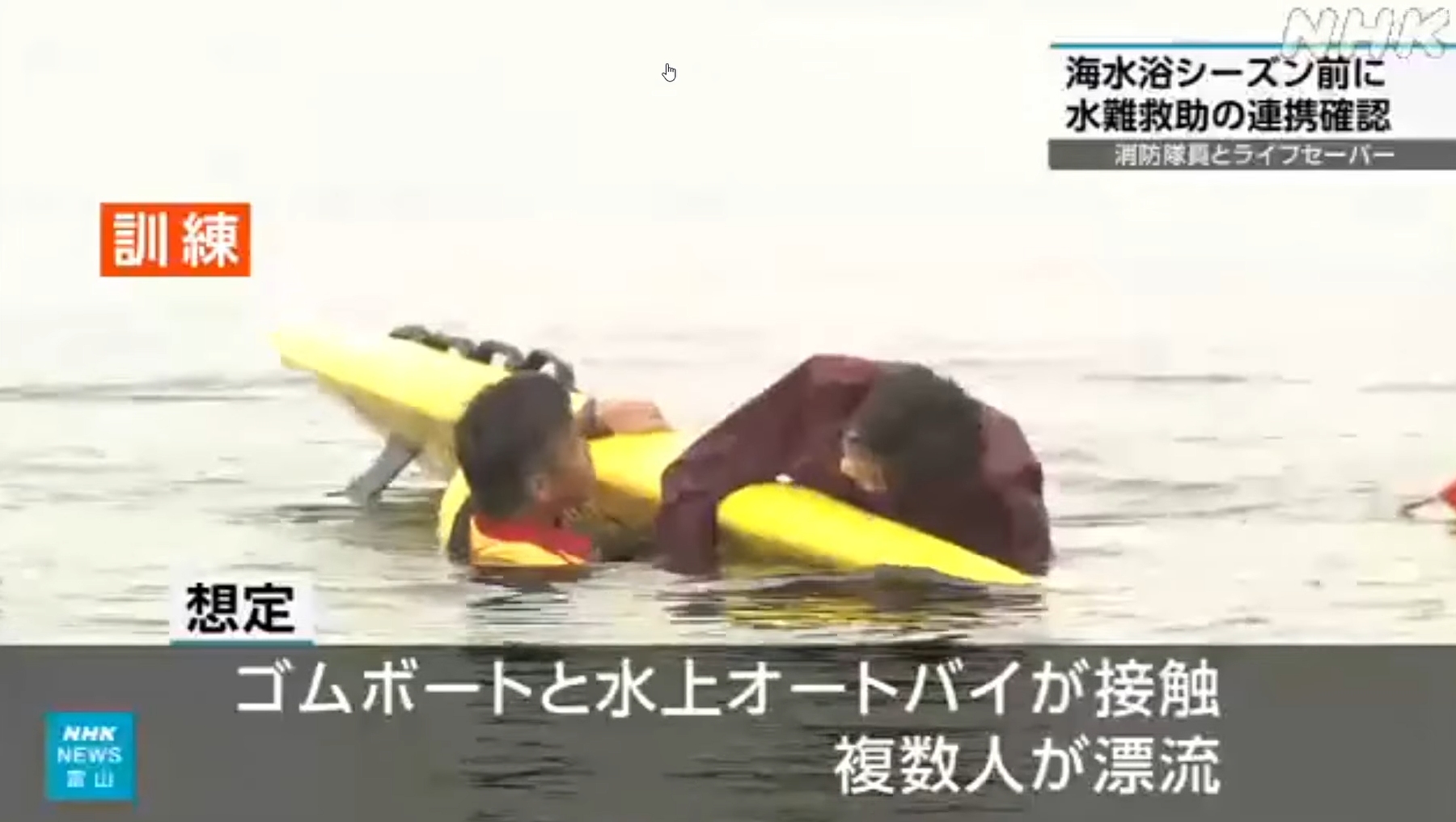 海水浴シーズン前に消防隊員がライフセーバーと救助訓練(NHK)